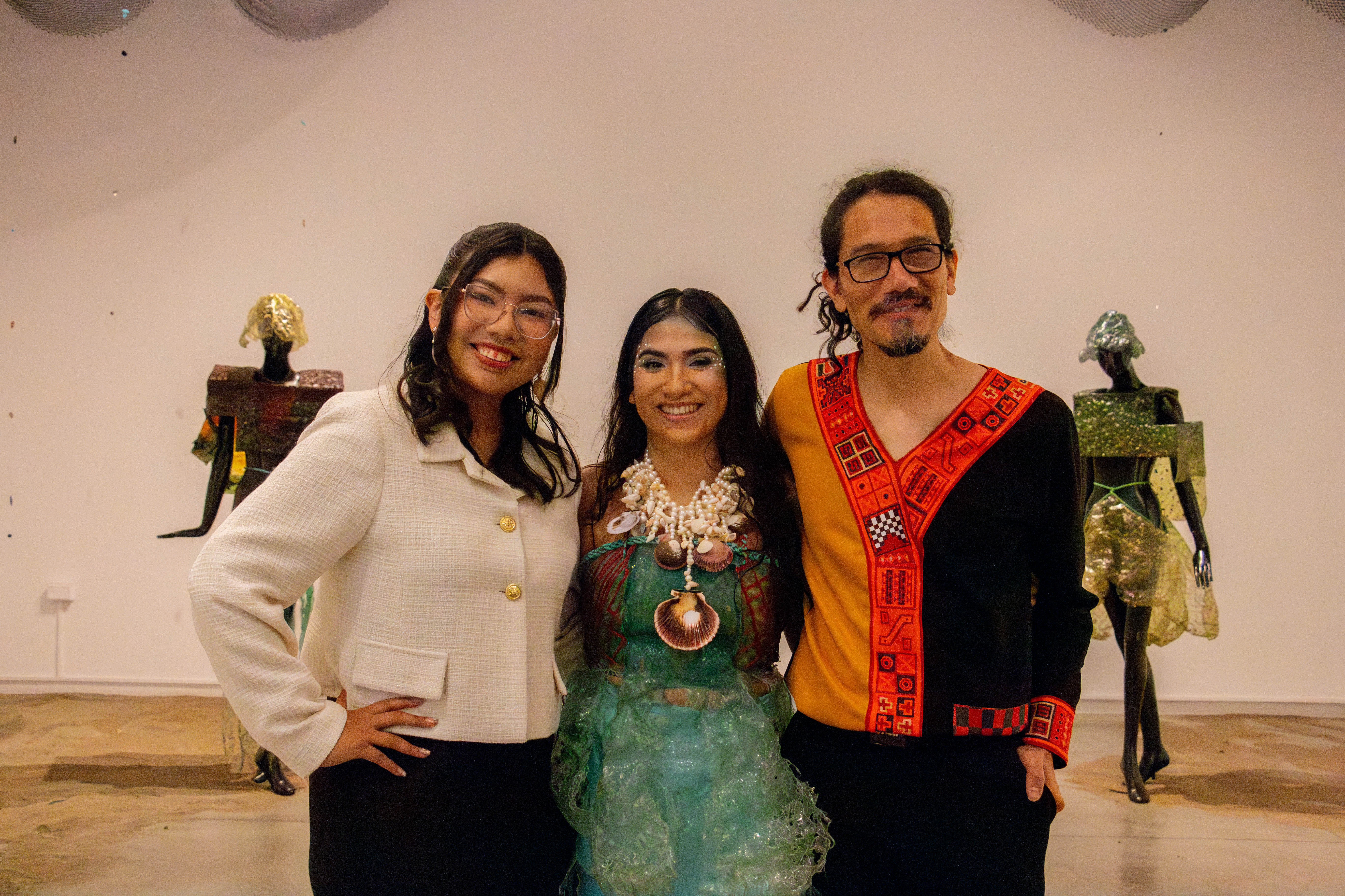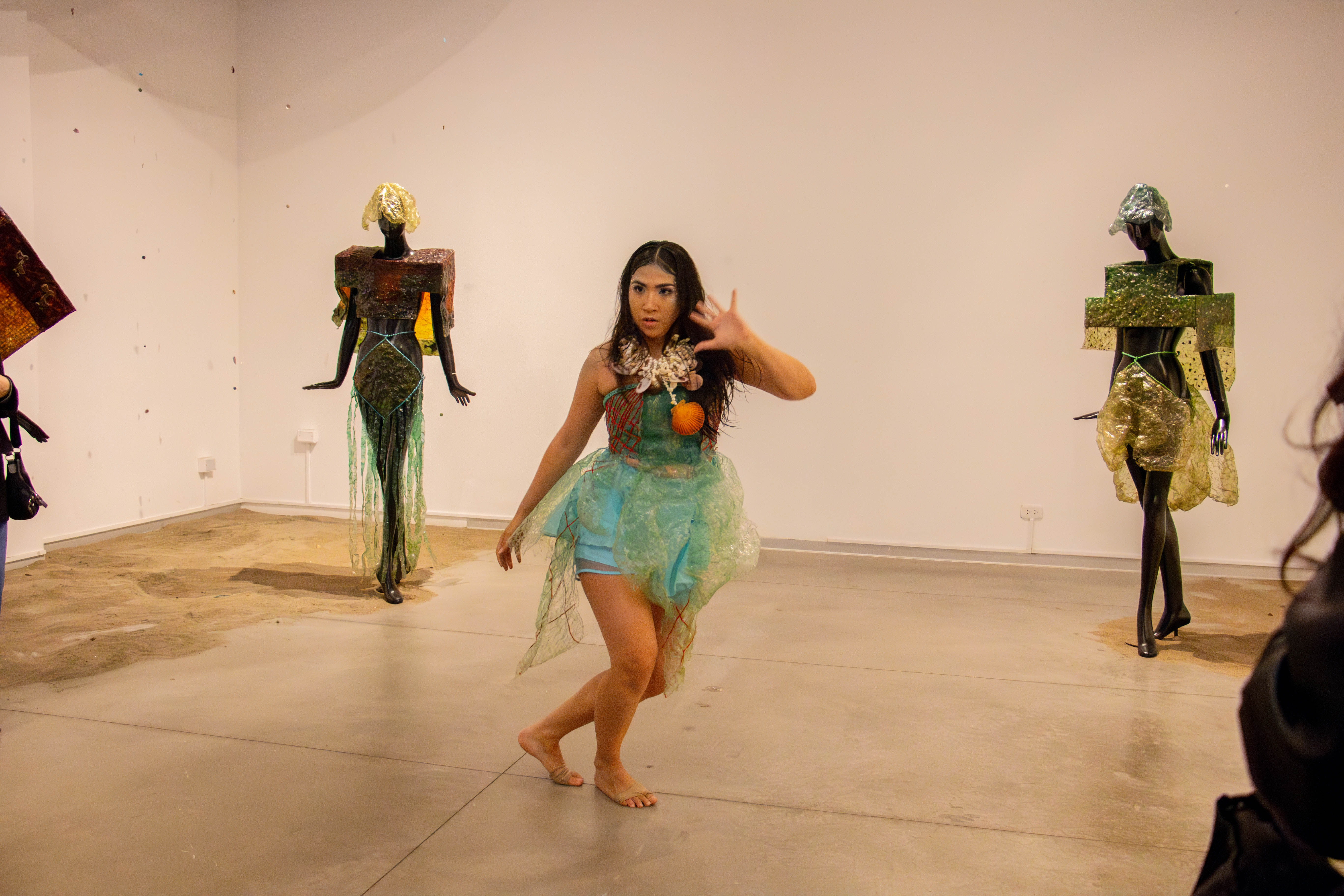 Para la creación de las obras, se han empleado elementos recolectados en playas de la costa norte del Perú, entre ellos recursos naturales encontrados en la orilla y residuos sintéticos descartados por pescadores artesanales. A través de procesos de exploración y prueba, estos materiales se transforman en superficies, volúmenes e indumentarias que revelan la posibilidad de restablecer la conexión entre cuerpo, materia y paisaje.